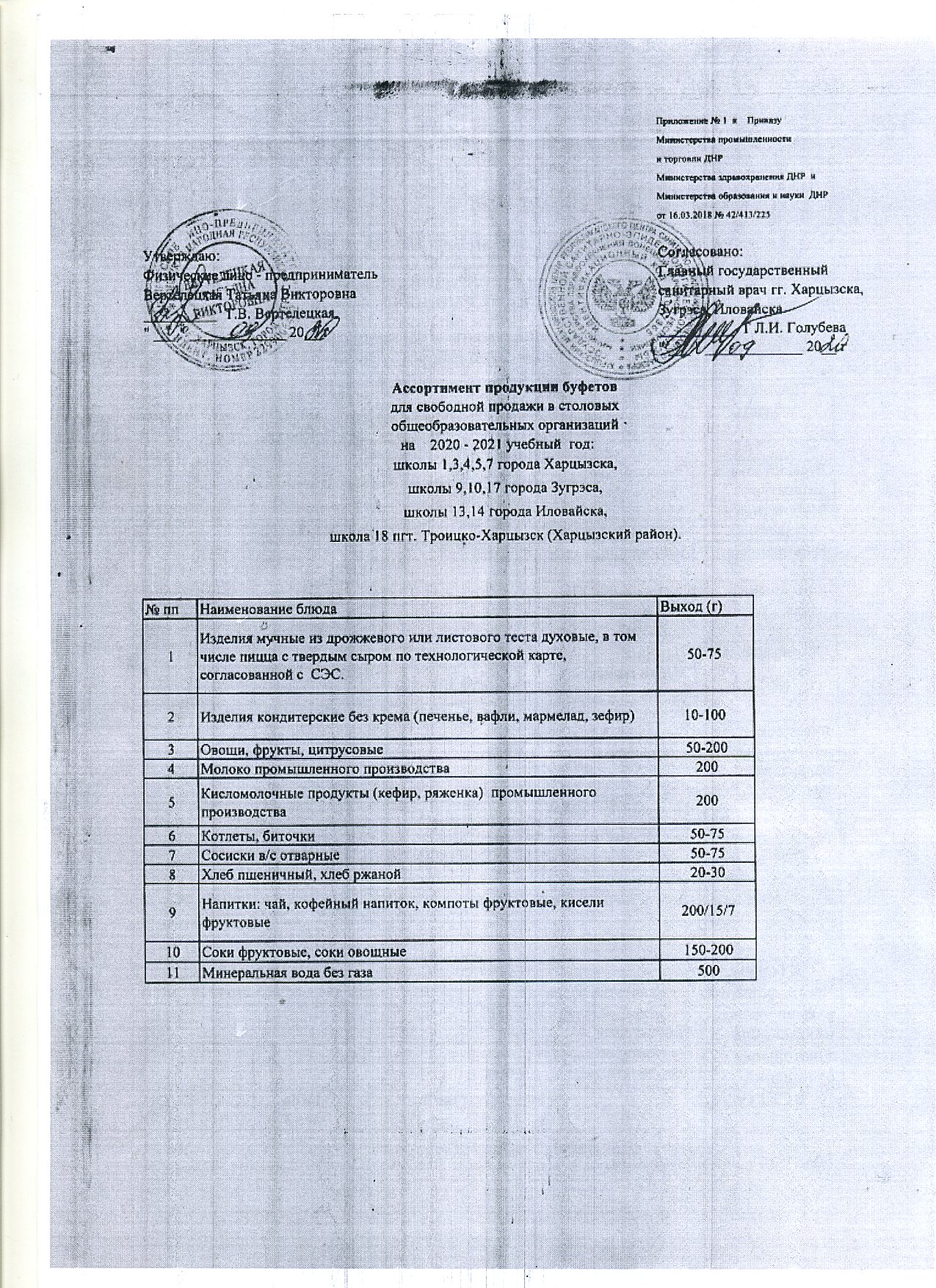 Toggle Заголовок Дата Скачать Документ СШ № 18 Питание январь март 2022 Популярные 10 янв 2022 Скачать Документ СШ № 18 Приказ Питание октябрь-декабрь 2021 Популярные 01 окт 2021 Скачать pdf СШ № 18, Административный контроль 2021 Популярные 01 сен 2021 Скачать pdf СШ № 18, Бракеражная комиссия 2021 Популярные 01 сен 2021 Скачать pdf СШ № 18, Организация дежурства 2021 Популярные 01 сен 2021 Скачать pdf СШ № 18, Организация питьевого режима 2021 Популярные 01 сен 2021 Скачать pdf СШ № 18, Почасовая циклограмма Популярные 01 сен 2021 Скачать pdf УО Харцызск Приказ № 315 Питание июль сентябрь Популярные 01 сен 2021 Скачать pdf 1 4 кл 10 дневное меню сентябрь декабрь Популярные 01 сен 2021 Скачать pdf 1 4, 5 11 кл 10 дневное меню сентябрь декабрь Популярные 01 сен 2021 Скачать pdf Ассортимент продукции буфетов Популярные 01 сен 2021 Скачать pdf Договор № 18 об организации питания Популярные 01 сен 2021 Скачать pdf ГПД 10 дневное меню сентябрь декабрь Популярные 01 сен 2021 Скачать pdf Разрешение на поставку продуктов Популярные 01 сен 2021 Скачать pdf Свидетельство Вертелецкая Популярные 01 сен 2021 Скачать pdf Согласие примерных двухнедельных меню Популярные 01 сен 2021 Скачать pdf Схема завоза продуктов Популярные 01 сен 2021 Скачать pdf Указ Главы ДНР Об организации бесплатного питания ГПД Популярные 01 сен 2021 Скачать Документ СШ № 18 Приказ Об организации питания в пришкольном лагере Популярные 31 мая 2021 Скачать Документ СШ № 18 Приказ О создании бракеражной комиссии в пришкольном лагере отдыха с дневным пребыванием в июне 2021 года Популярные 31 мая 2021 Скачать Документ СШ № 18 Приказ Об организации питьевого режима Популярные 31 мая 2021 Скачать Документ СШ № 18 Приказ № 49 Питание апрель июнь 09 04 2021 Популярные 09 апр 2021 Скачать Документ СШ № 18 Приказ №48 О внесении изменений в приказ № 43 Популярные 06 апр 2021 Скачать Документ СШ № 18 Приказ № 43 Питание апрель июнь 01 04 2021 Популярные 01 апр 2021 Скачать Документ СЭН № 244304 4, 06 08 2018 О согласовании режима Популярные 04 март 2021 Скачать pdf СанПиН 42 123 5777 91 СССР Популярные 04 март 2021 Скачать Документ СанПиН 42 123 5777 91 с изм на 12 10 2006 Популярные 04 март 2021 Скачать pdf Пр 0042 0413 0227, 16 03 2018 Ассорт буф продукции Популярные 04 март 2021 Скачать pdf МОН МТСП № 69 2 531, 17 09 2015 ЛК2 Популярные 04 март 2021 Скачать pdf МОН МТСП № 69 2 531, 17 09 2015 ЛК1 Популярные 04 март 2021 Скачать pdf МОН МПТ МЗ № 42 413 227, 16 03 2018 Меры по орг питания Популярные 04 март 2021 Скачать pdf МОН МЗ N1335 2203, 07 12 2017 Порядок питание Популярные 04 март 2021 Скачать Документ Список учащихся льготных категорий на питание за счёт средств из местного бюджета СШ № 18 Популярные 21 янв 2021 Скачать Документ СШ № 18 Приказ № 11 О внесении изменений в приказ № 07 «Об органи-зации питания учащихся в январе-марте 2021 год Популярные 21 янв 2021 Скачать Документ Советы для родителей Популярные 20 янв 2021 Скачать Изображение Ассортимент буфетной продукции 2020-2021 учебный год Популярные 20 янв 2021 Скачать pdf УО Харцызск Приказ № 14 «Об организации питания обучающихся и воспитанников в общеобразовательных организациях в январе - марте 2021 года» Популярные 12 янв 2021 Скачать Документ СШ № 18, Приказ № 07 Об организации питания обучающихся в январе – марте 2021 года Популярные 12 янв 2021 Скачать Документ Список обучающихся 1-11 классов льготной категории для бесплатного питания Популярные 23 дек 2020 Скачать Документ Приказ УО № 436 О выполнении Порядков орг питания Популярные 11 нояб 2020 Скачать Документ Порядок организации питания Популяр